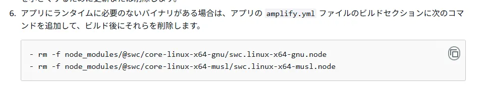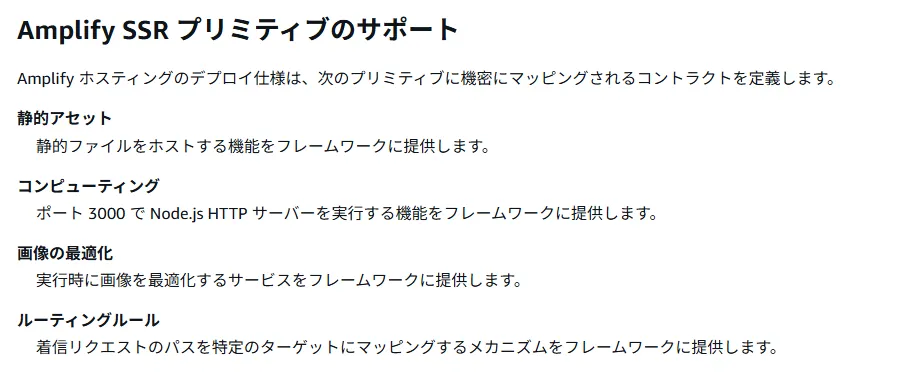 ビルド時にポート番号を3000にしてる件については、Amplifyのビルド出力設定ドキュメントにSSRは3000でみたいなこと書いてあったので一応ビルド時だけ3000にしてますが、たぶんポートはなんでもいいです。念のため。