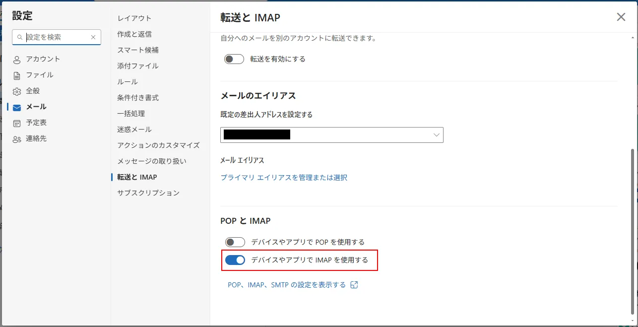 これで完了なのですが、1つ注意点があります。このIMAP有効化の設定、エイリアス追加後1日くらい設定を反映できません。