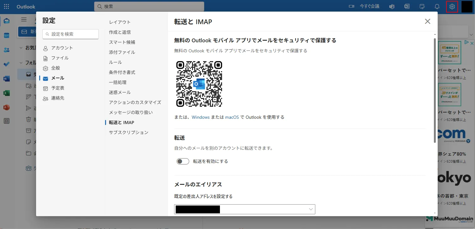 1. Outlookのウェブメールにアクセスして、設定画面を開き、「転送とIMAP」に行きます。