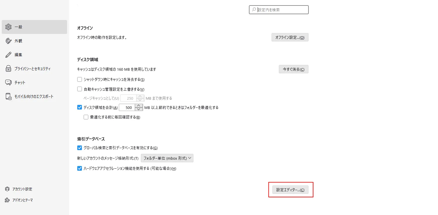 2. 下にスクロールすると設定エディタボタンを教えて「高度な設定」に行きます。