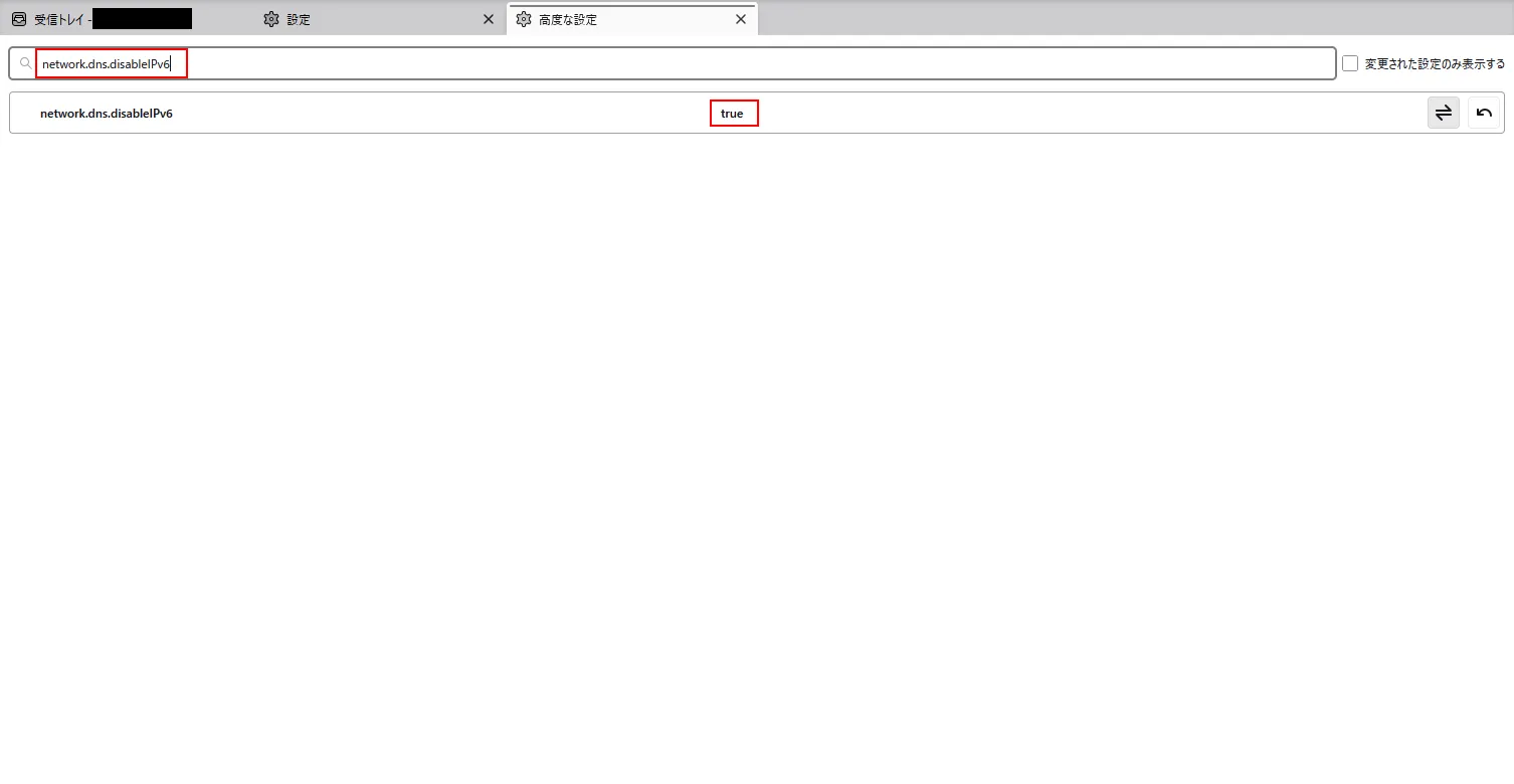 3. 検索窓に「network.dns.disableIPv6」を入力して「false」になってる値を「true」にします。