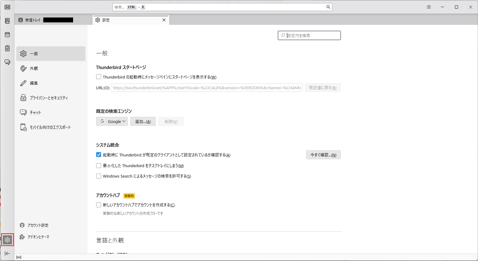 1. Thunderbirdを起動して左下の歯車から設定画面に行きます。